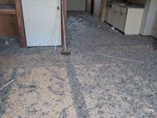 窓ガラスが外れている空き部屋に鳩が住み着いていたようで別事業部のスタッフ2人が清掃に入っているので